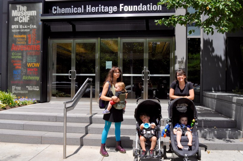 Today I had the opportunity to try a unique type of exhibition. The Chemical Heritage Foundation in Philadelphia just opened a walking tour of Old City titled, “Things Fall Apart”. I heard about this project on NPR a couple weeks ago and really wanted to check it out. What interested me about this program was the fact that it used an app as a tour guide and curator. I also figured it would make a great social activity, so I invited some friends to join us for some culture, fresh air, and exercise. Because this was a 90 minute tour, we made sure to take stollers rather than attempt having the children walk. The tour begins outside The Chemical Heritage Foundation on Chestnut St., so we hopped on the subway and our adventure began.