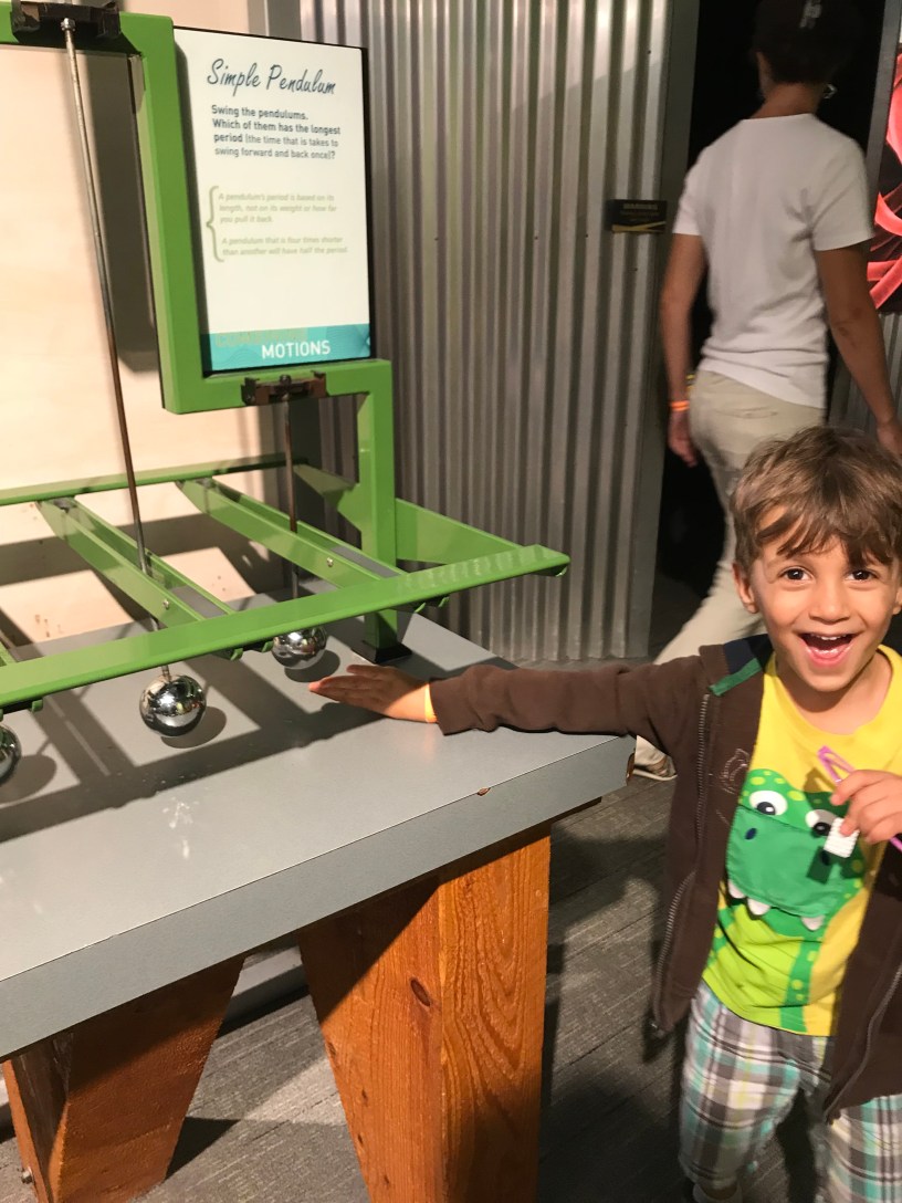 After the kids had their fill of watching these sculptures, we moved onto the various other activities in the room. There were so many different stations that I can’t list them all here. However some of our favorites were the sand pendulum, the Astro blaster, the simple pendulum and the wave generator. The sand pendulum used sand falling through a funnel to demonstrate the repetitive movement that pendulums produce. The Astro blaster demonstrated the transference of energy from one object to another. The simple pendulum contained pendulums of varying lengths and weights to demonstrate how these factors affect the speed of the swing. And the wave generator produced a visual representation of different “waves” by turning a crank.